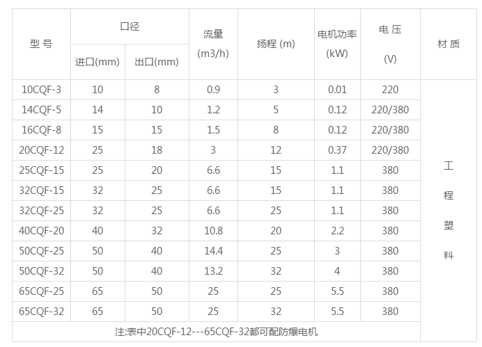 | 注:表中20CQF-12---65CQF-32都可配防爆电机 | |||||||